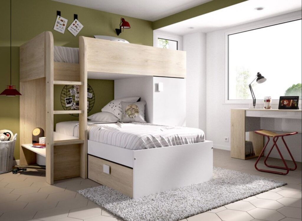 En este contexto, podemos decir que una cama litera tren puede ser la aliada perfecta. Su diseño permite aprovechar la altura de la habitación en el plano vertical y el espacio que se genera entre ambas camas para incluir elementos de almacenamiento funcionales, como armarios o cajones e incluso escritorios. Al concentrar estas funciones en un solo mueble, se libera la mayor parte del suelo, creando una zona más despejada para jugar o estudiar, como una mesa de escritorio.