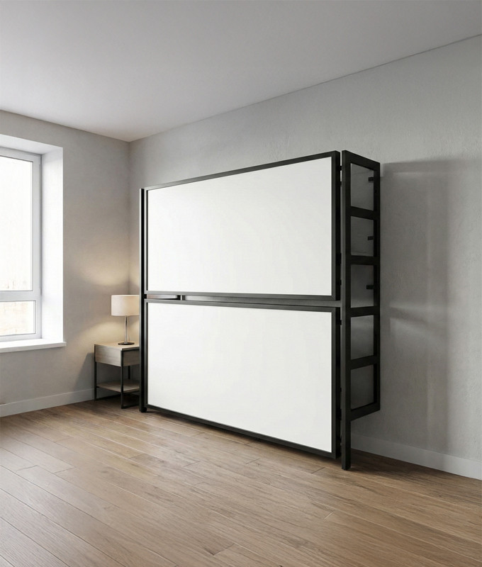 La litera tiene una APERTURA HORIZONTAL, permitiendo ocupar el mínimo espacio. Tiene espacio para COLCHONES CON UN GROSOR MÁXIMO DE 20 o 27 CM DEPENDIENDO DEL FONDO DE LA LITERA ELEGIDO.