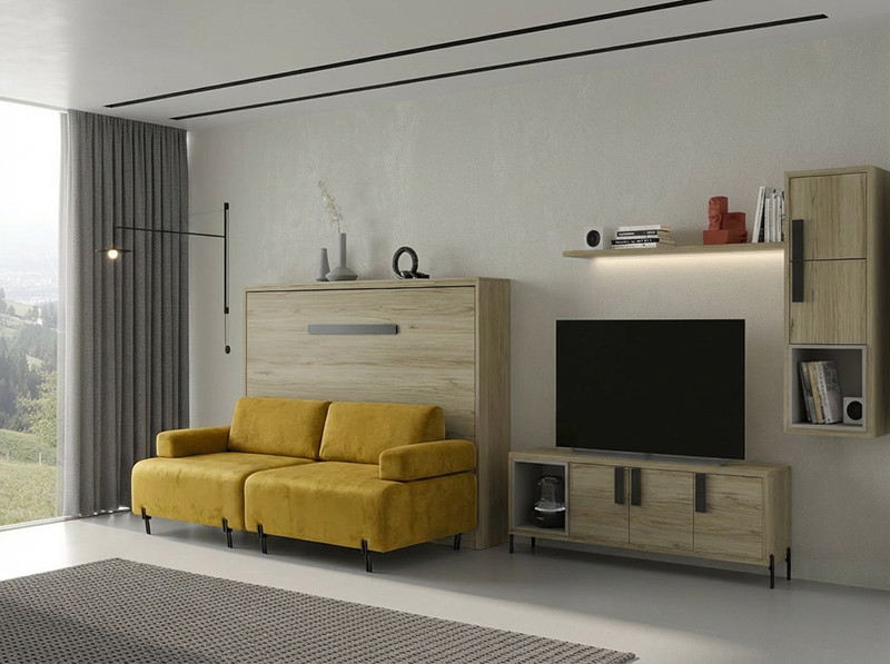 El mueble exterior está FABRICADO INTEGRAMENTE EN TABLERO MELAMÍNICO. La Estructura exterior fabricada en Colores Base y la puerta en Colores Base y Colores de Combinación. La cama tiene una APERTURA HORIZONTAL, permitiendo ocupar el mínimo espacio. Tiene espacio para UN COLCHÓN CON UN GROSOR MÁXIMO DE 20 o 26 CM DEPENDIENDO DEL FONDO ELEGIDO DE LA CAMA ELEGIDO. EL CONJUNTO DISPONE DE SISTEMAS HIDRAULICOS DE ABATIMIENTO Y SE SUJETA A LA PARED MEDIANTE TACOS,