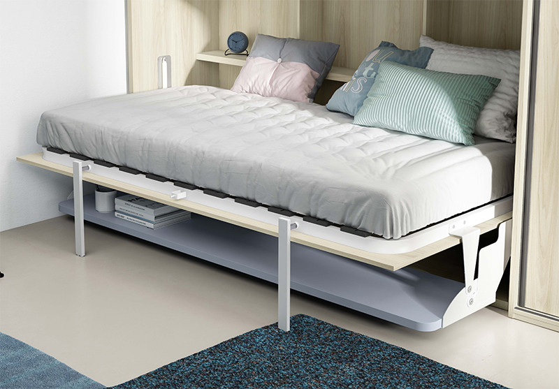 La cama tiene una APERTURA HORIZONTAL, permitiendo ocupar el mínimo espacio. Tiene espacio para UN COLCHÓN CON UNA ALTURA MÁXIMA DE 22 CM.