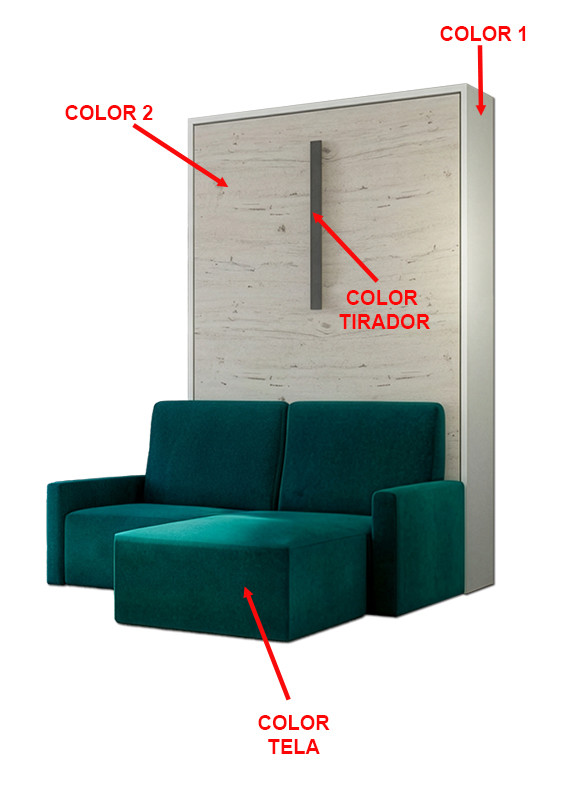 El mueble exterior está FABRICADO INTEGRAMENTE EN TABLERO MELAMÍNICO. La Estructura exterior fabricada en Colores Base y la puerta en Colores Base y Colores de Combinación. La cama tiene una APERTURA VERTICAL, permitiendo ocupar el mínimo espacio. Tiene espacio para UN COLCHÓN CON UN GROSOR MÁXIMO DE 20 o 26 CM DEPENDIENDO DEL FONDO ELEGIDO DE LA CAMA ELEGIDO. EL CONJUNTO DISPONE DE SISTEMAS HIDRAULICOS DE ABATIMIENTO Y SE SUJETA A LA PARED MEDIANTE TACOS,