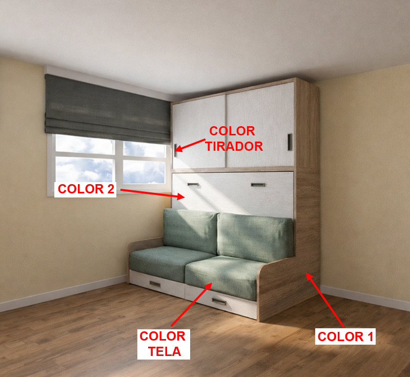 El mueble exterior está FABRICADO INTEGRAMENTE EN TABLERO MELAMÍNICO. La Estructura exterior fabricada en Colores Base y la puerta en Colores Base y Colores de Combinación. La cama tiene una APERTURA HORIZONTAL, permitiendo ocupar el mínimo espacio. La cama tiene una APERTURA HORIZONTAL, permitiendo ocupar el mínimo espacio. Tiene espacio para UN COLCHÓN CON UNA ALTURA MÁXIMA DE 20 O 26 CM A ELEGIR.