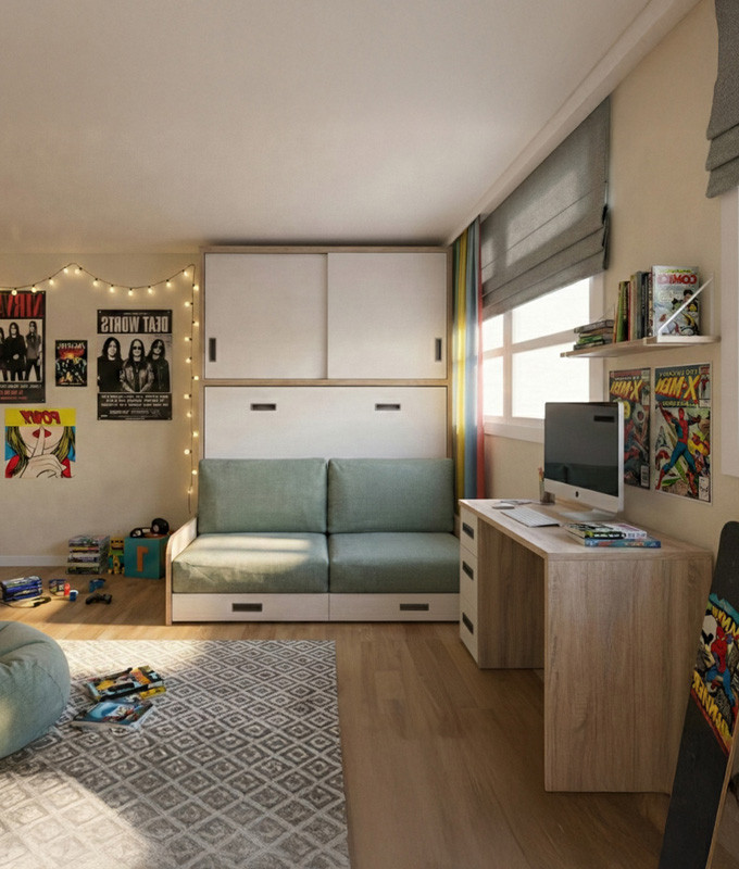 Este mueble es ideal para habitaciones juveniles dónde el espacio es fundamental, de este modo incluir un escritorio o una zona de ocio será tarea fácil al poder prescindir del espacio dedicado a descansar. Los diferentes tonos están especialmente indicados para crear ambientes adecuados a tus necesidades. El conjunto te sorprenderá por su óptima integración en tu espacio, obteniendo un resultado de estilo moderno y funcional.