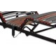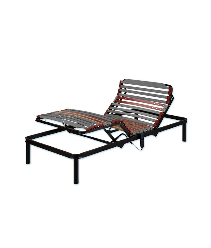 Somier con articulaciones eléctricas con 5 posiciones reales. Dispone de láminas de madera independientes ordenadas de dos en dos (12x2) mediante Soportes de caucho antideslizantes y basculantes, zona central reforzada y con regulación lumbar 4 (2x2). Esta equipado con un motor silencioso de gran potencia que dispone de bajada de emergencia en caso de corte de corriente.