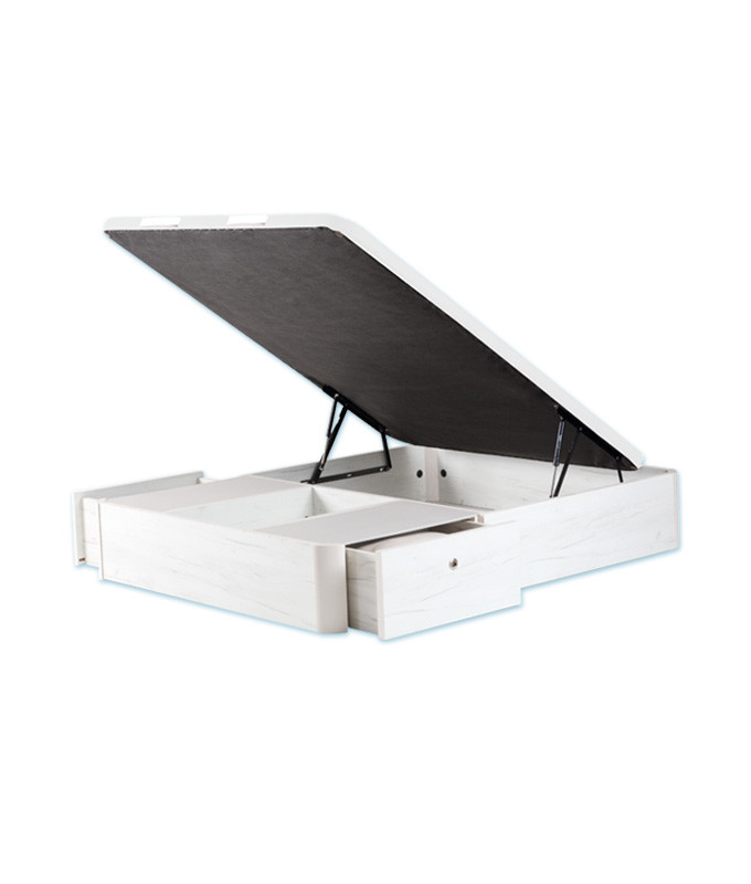 Este Canapé incorpora CAJONES LATERALES de gran capacidad que facilitan el acceso a los objetos guardados sin necesidad de levantar la tapa del canapé, esto le confiera una funcionalidad superior al resto de canapés del mercado. Incorpora dos cajones de 40 cm de fondo y un hueco central de medida variable en función del ancho elegido.