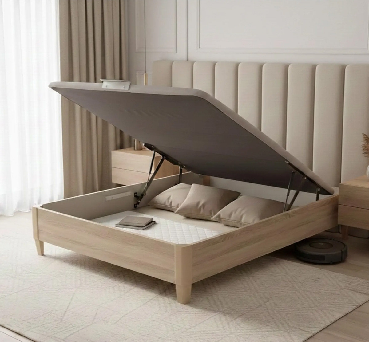 Consiga una Superficie extra de almacenaje, gracias a este práctico canapé, es ideal para habitaciones pequeñas o hábitats con pocos huecos destinados a almacenaje. Está fabricado en laminados de alta calidad, consiguiendo una perfecta armonía con el mobiliario para dormitorios y una Higiene y durabilidad garantizada.