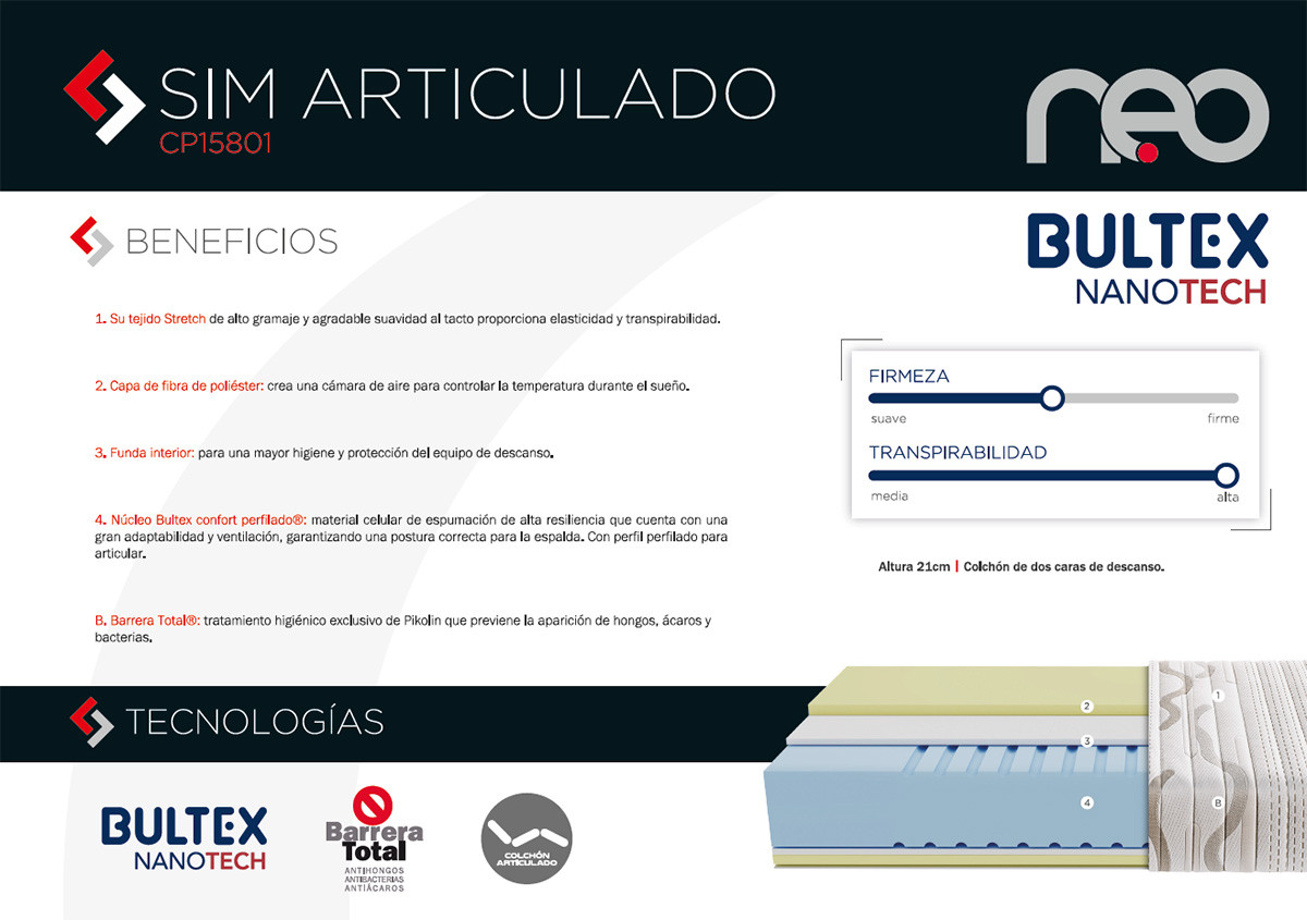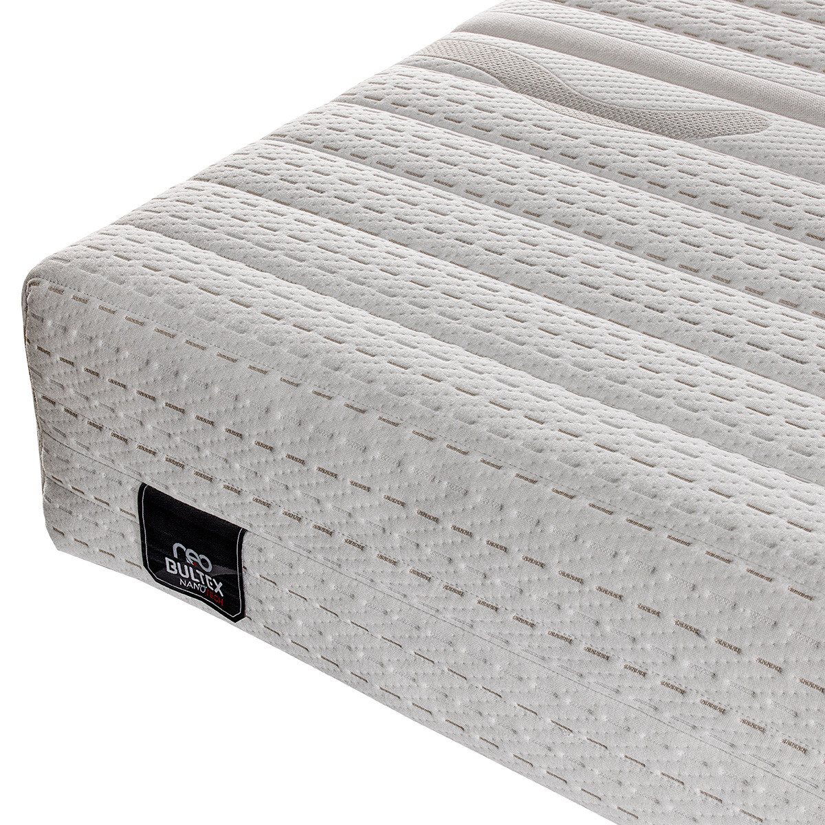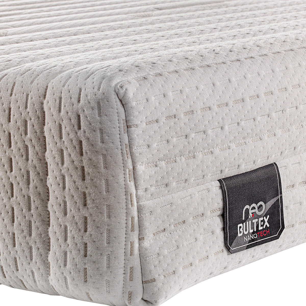 El bloque Bultex confort perfilado potencia una acogida gradual y actúa de forma activa en las zonas en las que el cuerpo más lo necesita. Este núcleo va perfilado para favorecer la articulación. El Bultex, es una materia alveolar de última generación, destaca por su elasticidad y permite una mayor adaptación a los movimientos durante el descanso. La estructura de célula irregular de Bultex beneficia una mayor aireación, siendo 95% permeable al aire. Ningún material que no sea muelle supera a Bultex en nivel higiénico y de aireación. La forma de fabricación exclusiva de Bultex le permite superar de una forma óptima el paso de los años, lo que incrementa su vida útil.