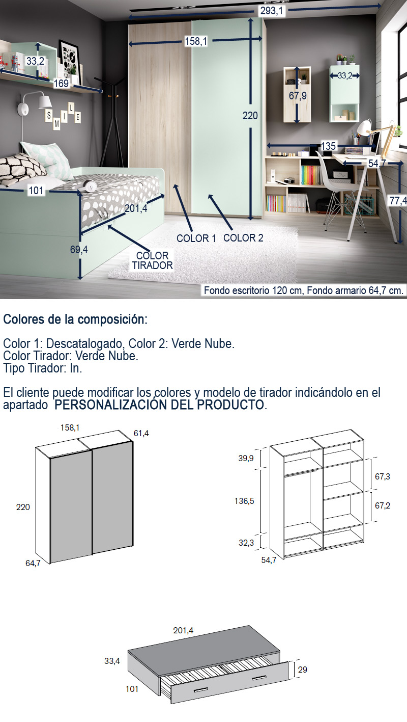 En el precio está incluido el transporte con subida a domicilio (montaje opcional). En dicho precio no están incluidos los colchones, almohadas, sillas y demás elementos decorativos de la recreación. El cliente puede modificar los colores y modelo de tirador indicándolo en el apartado “PERSONALIZACIÓN DEL PRODUCTO”. Si el cliente lo desea puede enviarnos un correo a info@colchonclub.es con las medidas y fotografías de la habitación y le haremos una recreación personalizada de cómo quedaría la composición o una variante de la misma en su habitación.
