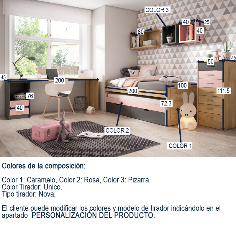 En el precio está incluido el transporte con subida a domicilio (montaje opcional). En dicho precio no están incluidos los colchones, almohadas, sillas y demás elementos decorativos de la recreación. El cliente puede modificar los colores y modelo de tirador indicándolo en el apartado “PERSONALIZACIÓN DEL PRODUCTO”.