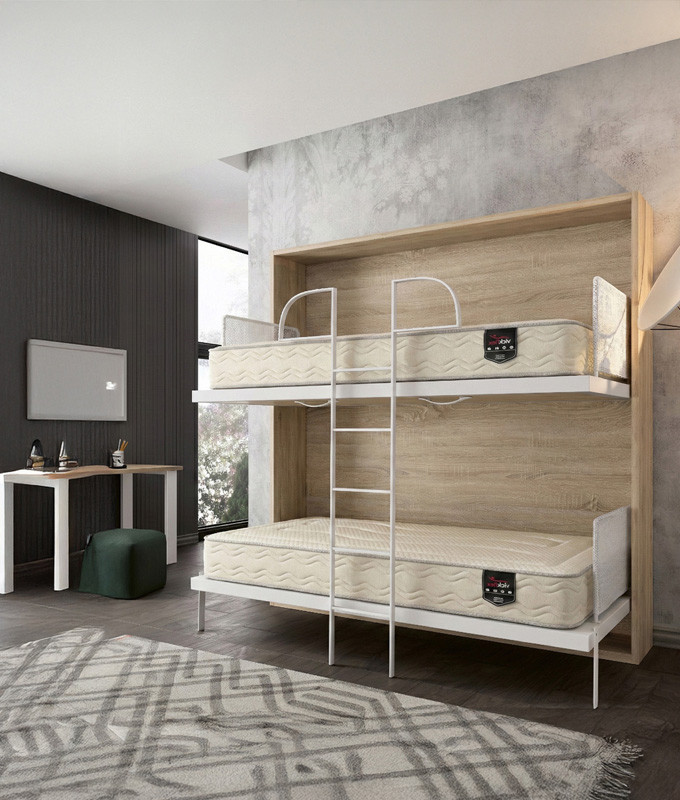 Las camas tienen una APERTURA HORIZONTAL, permitiendo ocupar el mínimo espacio. Tiene espacio para 2 COLCHONES CON UN GROSOR MÁXIMO DE 20 CM.