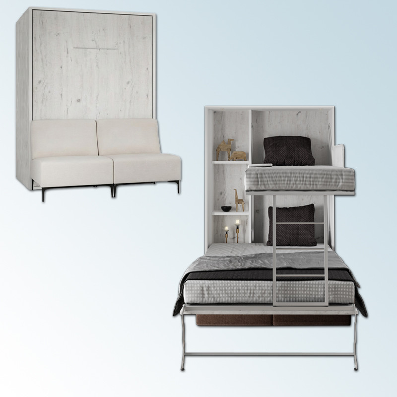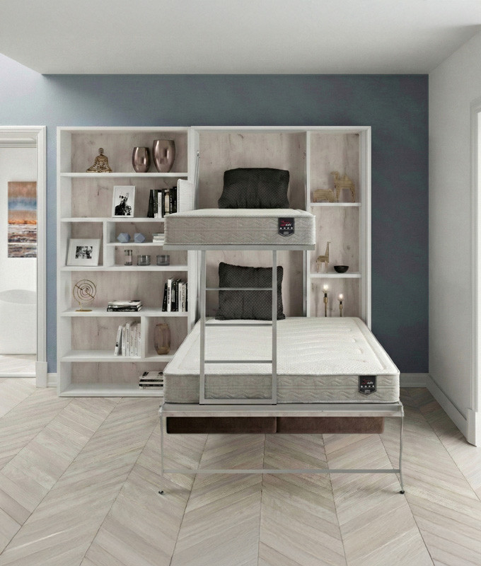 Las camas tienen una APERTURA VERTICAL, permitiendo ocupar el mínimo espacio. Tiene espacio para 2 COLCHONES CON UN GROSOR MÁXIMO DE 20 CM.