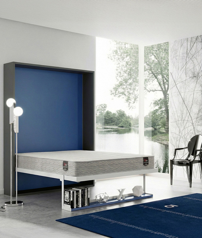 La cama tiene una APERTURA VERTICAL, permitiendo ocupar el mínimo espacio. Tiene espacio para UN COLCHÓN CON UN GROSOR MÁXIMO DE 20 CM.