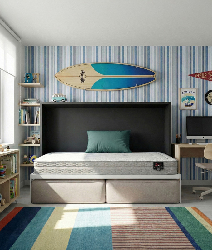 Este mueble es ideal para habitaciones juveniles dónde el espacio es fundamental, de este modo incluir un escritorio o una zona de ocio será tarea fácil al poder prescindir del espacio dedicado a descansar. Los diferentes tonos están especialmente indicados para crear ambientes adecuados a tus necesidades. El conjunto te sorprenderá por su óptima integración en tu espacio, obteniendo un resultado de estilo moderno y funcional.