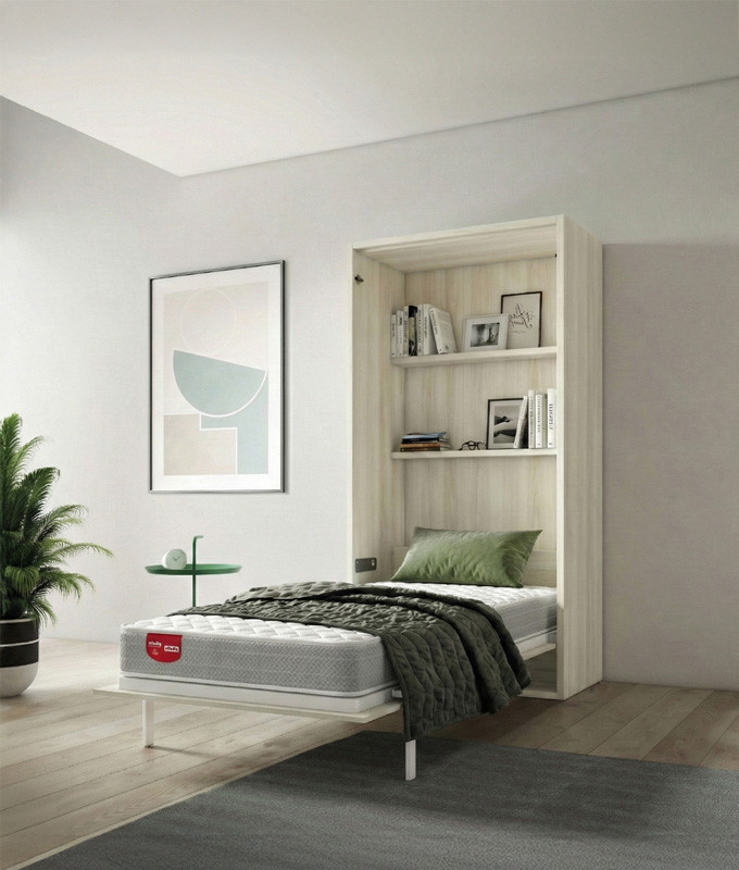 La cama tiene una APERTURA VERTICAL, permitiendo ocupar el mínimo espacio. Tiene espacio para UN COLCHÓN CON UNA ALTURA MÁXIMA DE 22 CM. DISPONIBLE EN FONDOS DE 40 CM Y DE 57 CM CON ESTANTES INTERIORES.
