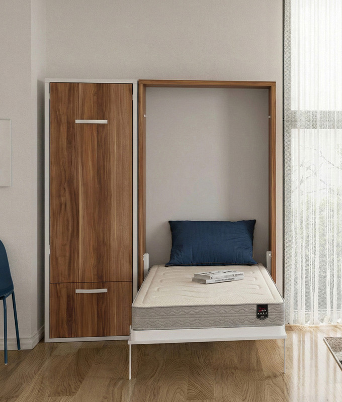 El mueble exterior está FABRICADO INTEGRAMENTE EN TABLERO MELAMÍNICO. La Estructura exterior fabricada en Colores Base y la puerta en Colores Base y Colores de Combinación. La cama tiene una APERTURA VERTICAL, permitiendo ocupar el mínimo espacio. EL CONJUNTO DISPONE DE SISTEMAS HIDRAULICOS DE ABATIMIENTO Y SE SUJETA A LA PARED MEDIANTE TACOS.