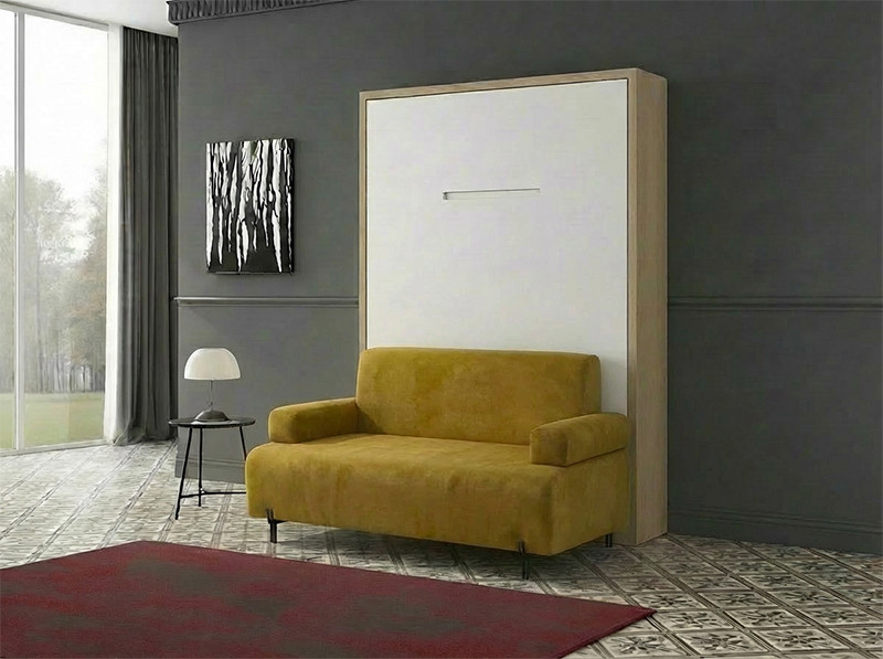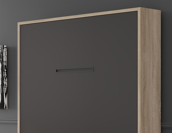 El mueble exterior está FABRICADO INTEGRAMENTE EN TABLERO MELAMÍNICO. La Estructura exterior fabricada en Colores Base y la puerta en Colores Base y Colores de Combinación. La cama tiene una APERTURA VERTICAL, permitiendo ocupar el mínimo espacio. Tiene espacio para UN COLCHÓN CON UN GROSOR MÁXIMO DE 20 CM. EL CONJUNTO DISPONE DE SISTEMAS HIDRAULICOS DE ABATIMIENTO Y SE SUJETA A LA PARED MEDIANTE TACOS,
