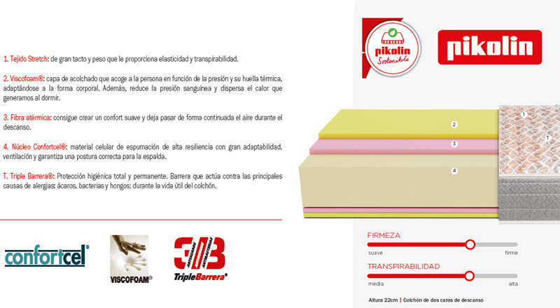 Su Núcleo CONFORTCEL, con estructura de célula abierta, consigue proporcionar un soporte que conforma una base equilibrada de descanso. La combinación de diferentes densidades de Confortcel crea una sensación de descanso progresivo, variando en función de la postura adoptada para el descanso. La fabricación de Confortcel se realiza bajo los más estrictos parámetros de calidad, garantizando que el producto no afecta negativamente a la salud. La fabricación de confortcel logra que su entramado celular resista mejor el paso del tiempo que otros materiales HR. La composición celular de Confortcel permite la circulación del aire, consiguiendo un entorno mas equilibrado en temperatura y humedad. La protección higiénica que aporta la Triple Barrera® en las capas de acolchado, bloquea el desarrollo de bacterias, ácaro y hongos.