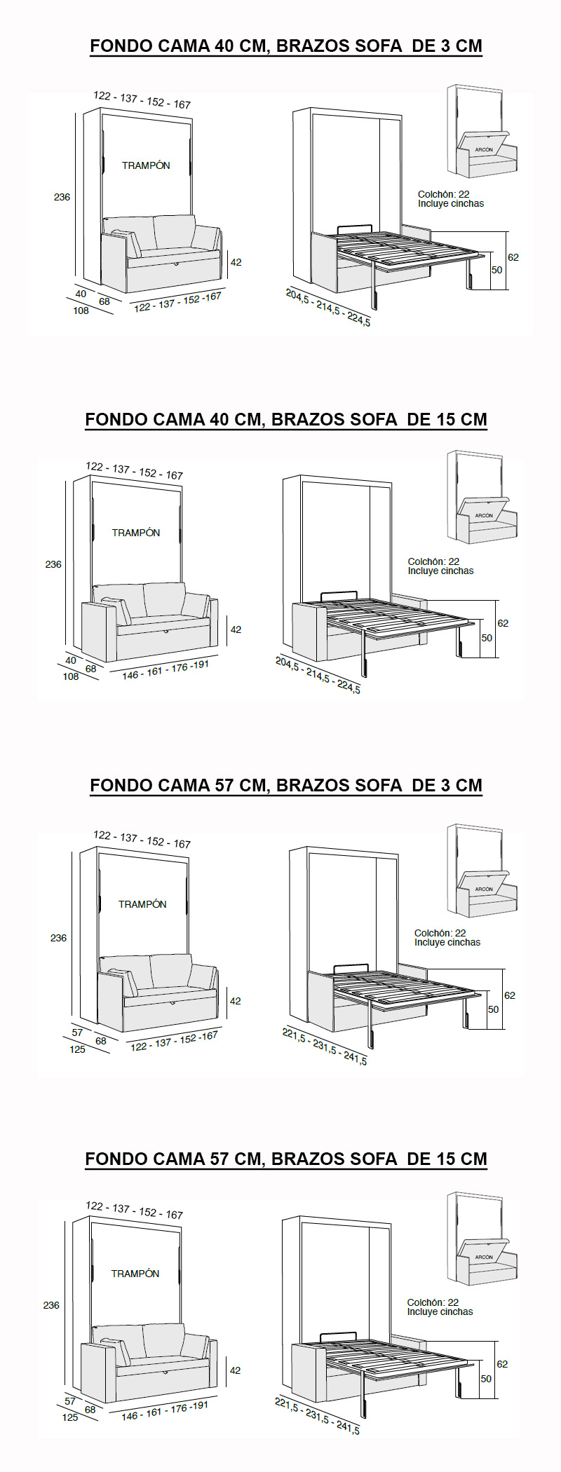 El mueble exterior está FABRICADO INTEGRAMENTE EN TABLERO MELAMÍNICO. La Estructura exterior fabricada en Colores Base y la puerta en Colores Base y Colores de Combinación. La cama tiene una APERTURA VERTICAL, permitiendo ocupar el mínimo espacio. Tiene espacio para UN COLCHÓN CON UNA ALTURA MÁXIMA DE 22 CM.