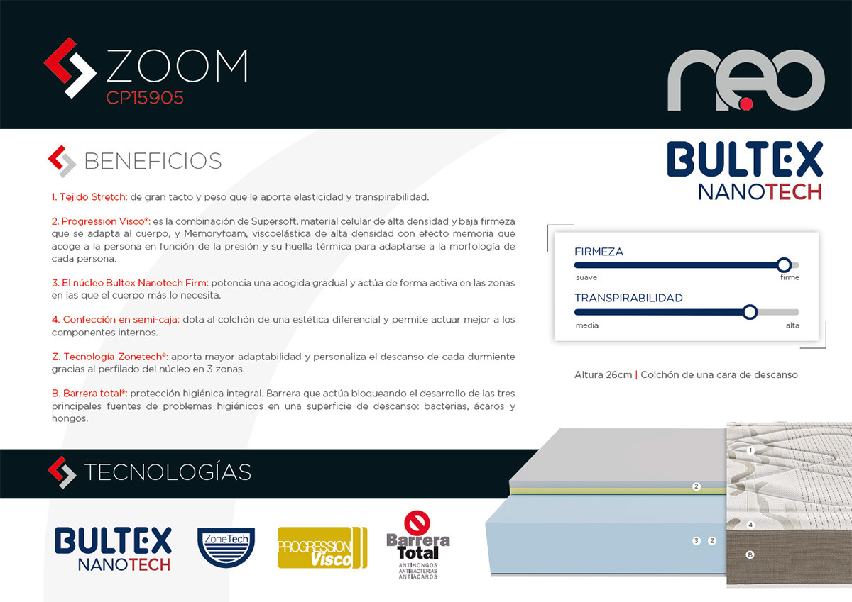 El Núcleo Bultex Nanotech Firm se adapta al peso y la musculatura para conseguir un apoyo preciso. La capa de viscoelástica MEMORY FOAM contribuye a disminuir los puntos de presión sobre el cuerpo facilitando un mejor confort.
