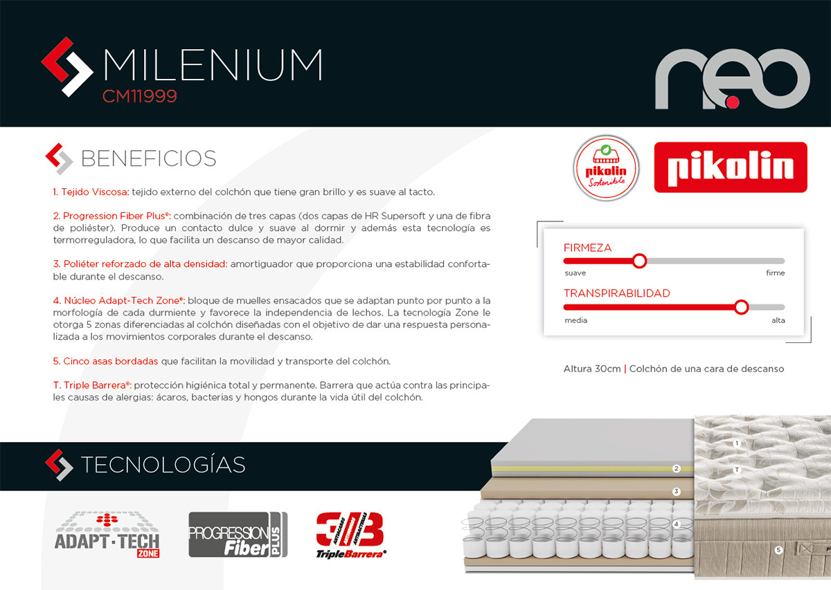 Su tejido Strech con gran capacidad elástica, acoge el cuerpo de forma gradual para una mayor relajación de los músculos y facilita los movimientos durante el descanso. El tejido strech permite que la humedad se evapore de forma más rápida y consigue un tacto más suave al descansar. La protección higiénica que aporta la Triple Barrera® en las capas de acolchado, bloquea el desarrollo de bacterias, ácaro y hongos.